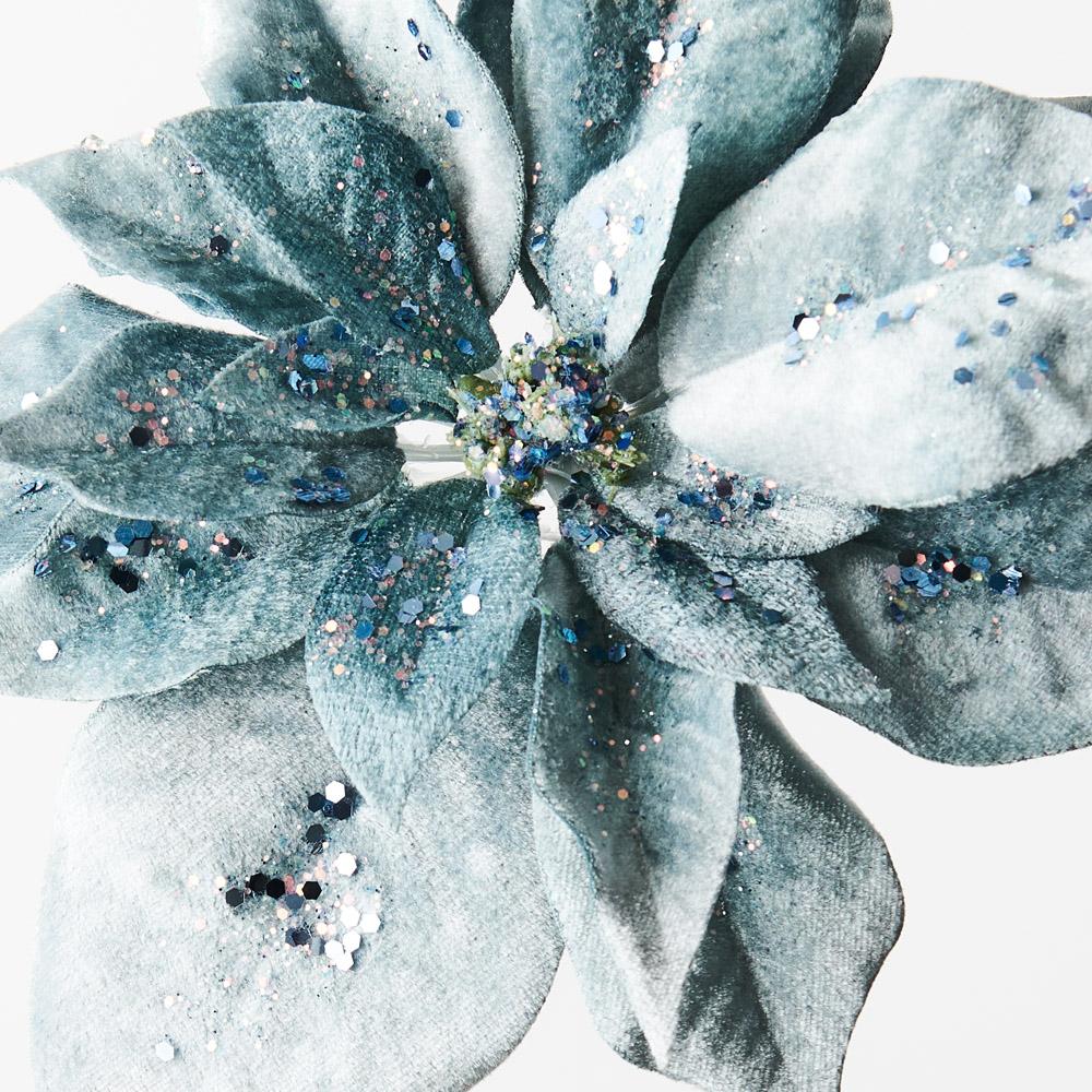 Presenting our Sky Velvet Poinsettia Clip for a truly enchanting Christmas. Crafted with luxurious velvet petals and adorned with glitter finishes, each bloom embodies festive elegance, adding a touch of holiday magic to your decor.