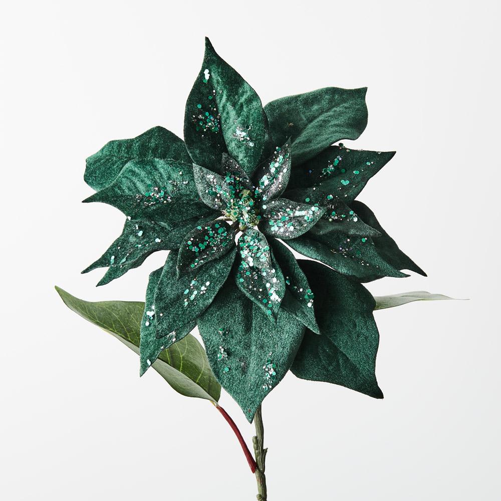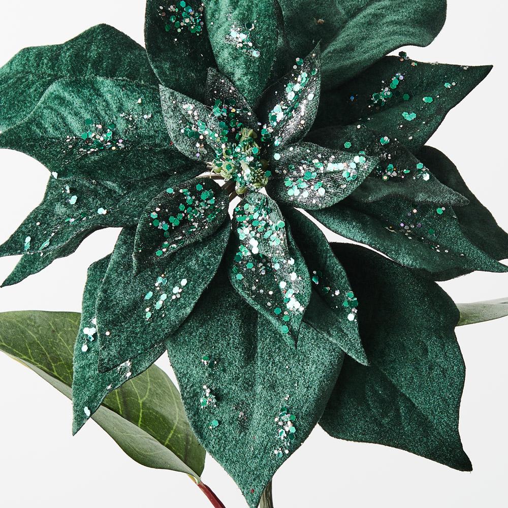 Presenting our Emerald Velvet Poinsettia for a truly enchanting Christmas. Crafted with luxurious velvet petals and adorned with glitter finishes, each bloom embodies festive elegance, adding a touch of holiday magic to your decor.