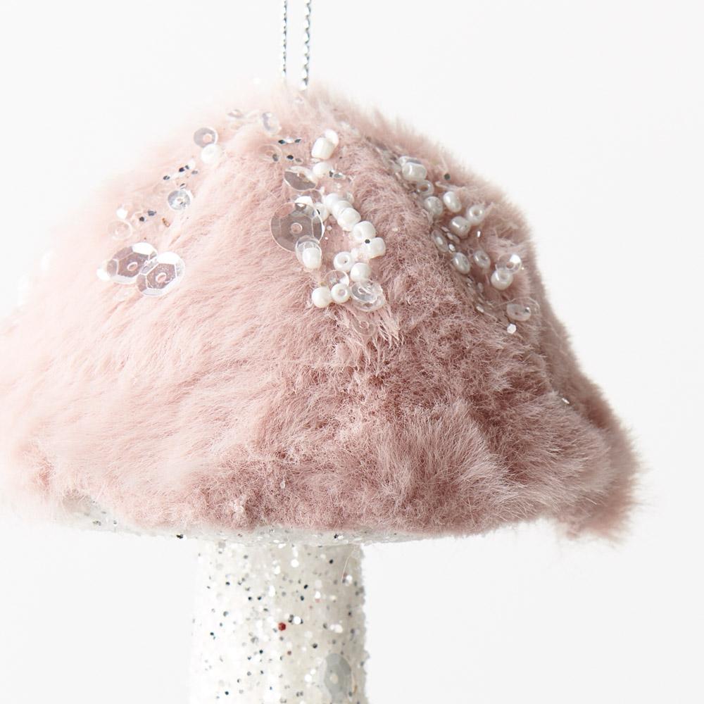 Introducing our Enchanting Pink and White Mushroom Christmas Ornament. Delight in the whimsical charm of this fluffy ornament adorned with glitter details. Its soft hues bring a touch of magic to your holiday decor, creating a fairytale ambiance that sparks joy and festive cheer.