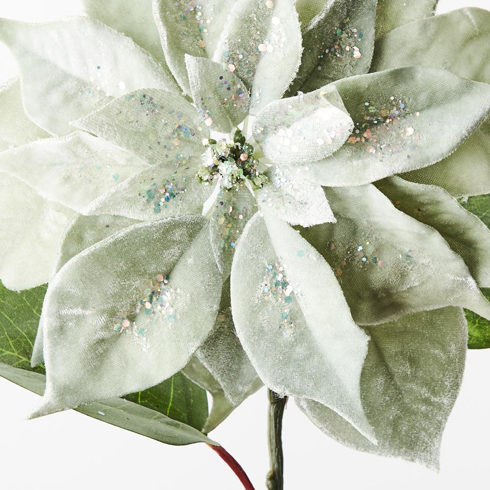 Presenting our Sage Velvet Poinsettia for a truly enchanting Christmas. Crafted with luxurious velvet petals and adorned with glitter finishes, each bloom embodies festive elegance, adding a touch of holiday magic to your decor.