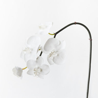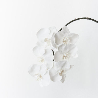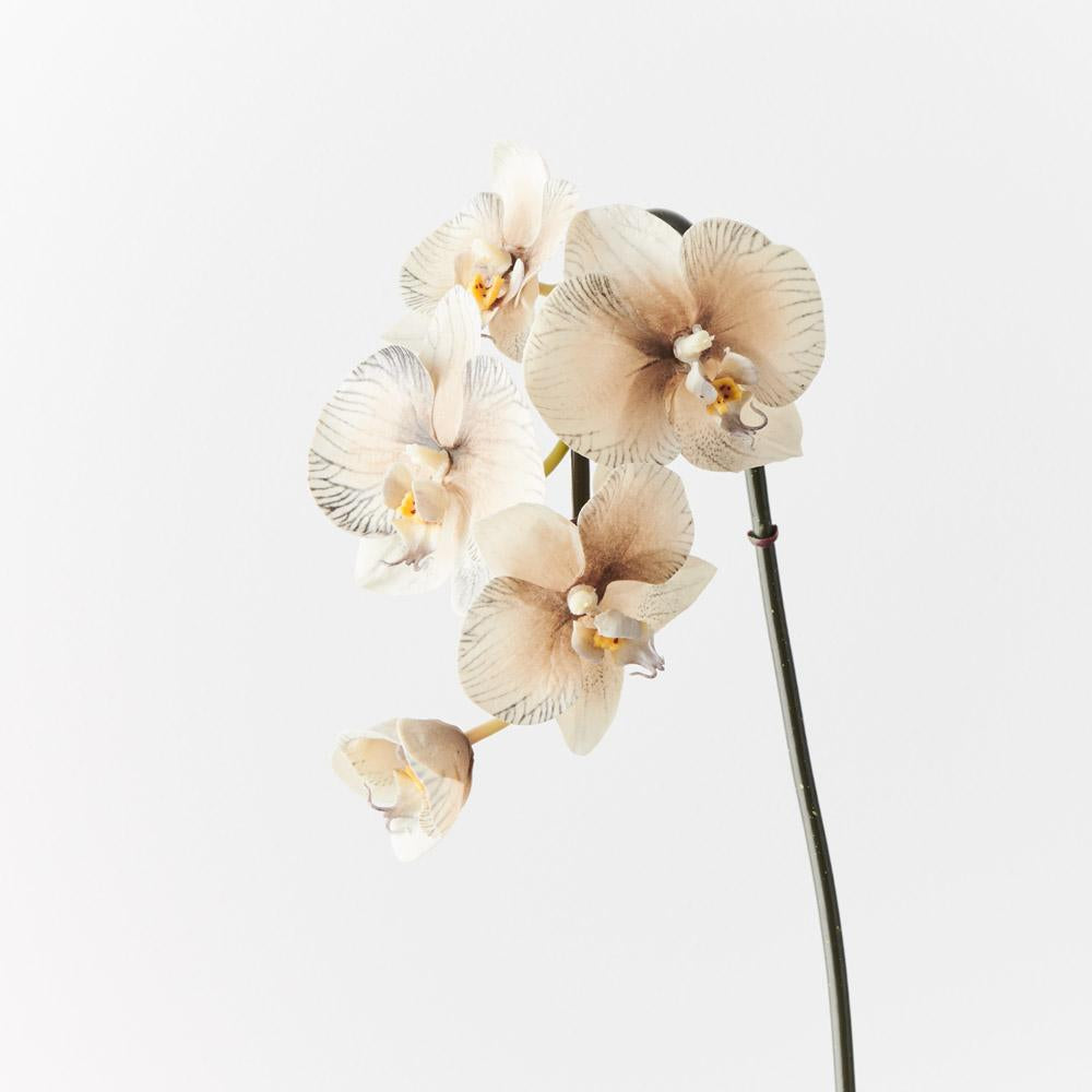 Bring a dash of colour to your interior space with this gorgeous faux Orchid Phalaenopsis Infused Mini stem in almond. Easily maintained this incredibly realistic artificial flower stem will bring lasting beauty into your home. Create a one of a kind artificial arrangement mixing with other stems or place in a decorative vase on its own. For longer lasting faux flower stems keep out of direct sunlight.