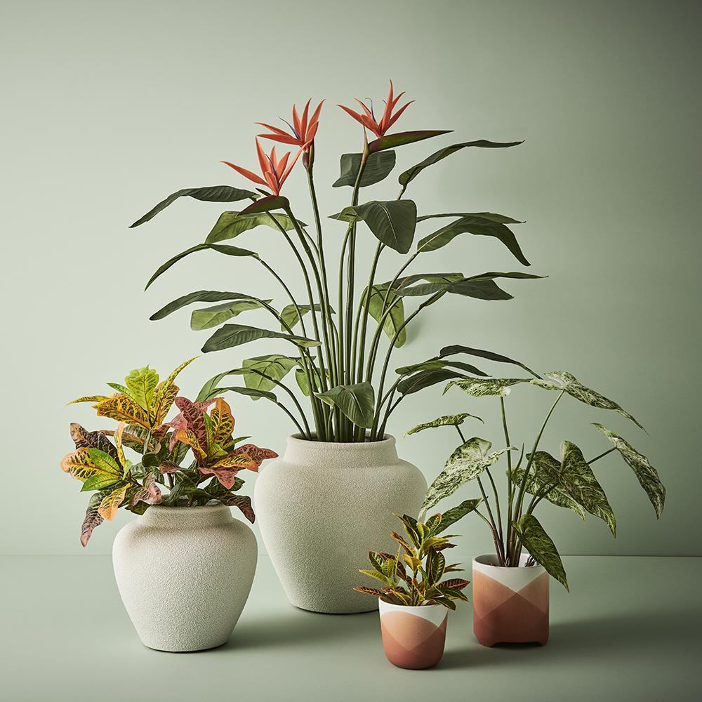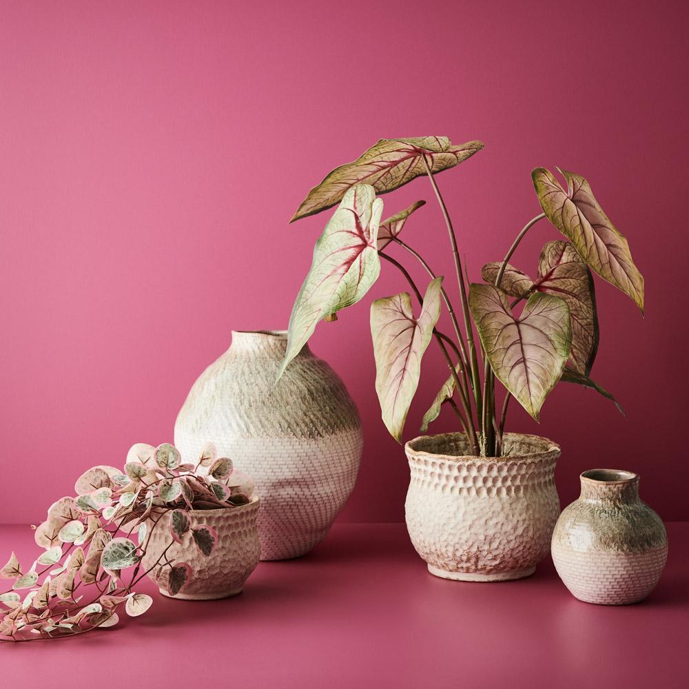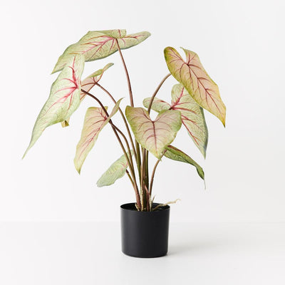Bring nature into your space all year round with Floral Interiors artificial plants. This caladium in green pink comes premade in a plastic pot, ready to be placed in a stylish pot of your choice. (Not suitable for outdoor use). Select from our range of complimenting pots in varying styles, colours and designs to suit any decor.