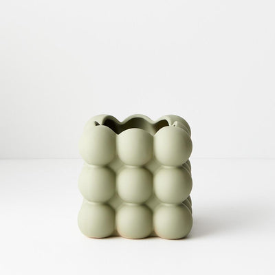 This white, hand-finished pot features an organic, cloud-like shape that widens from bottom to top. Its unique green moss-coloured glaze adds a touch of elegance, creating a dreamy and serene aesthetic.