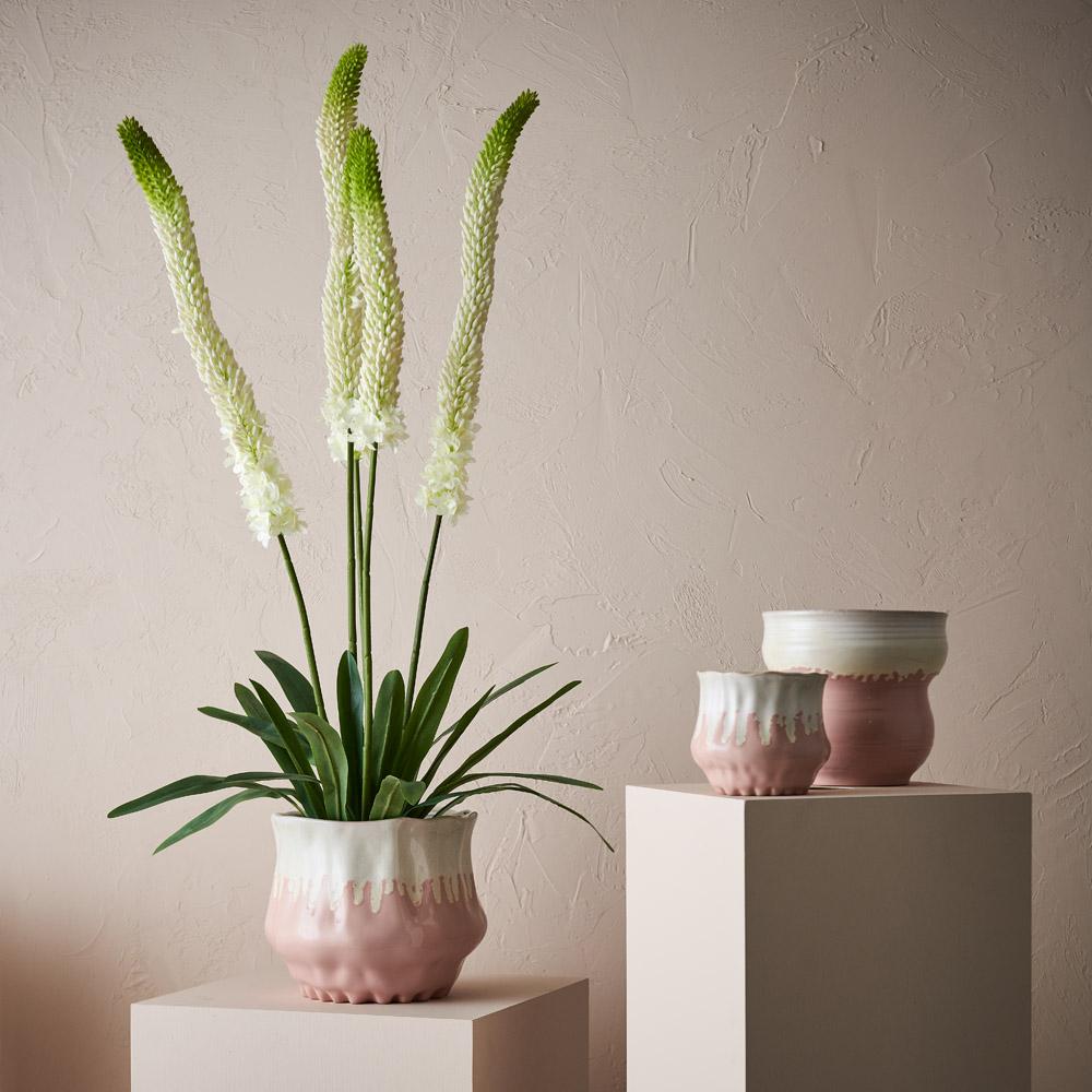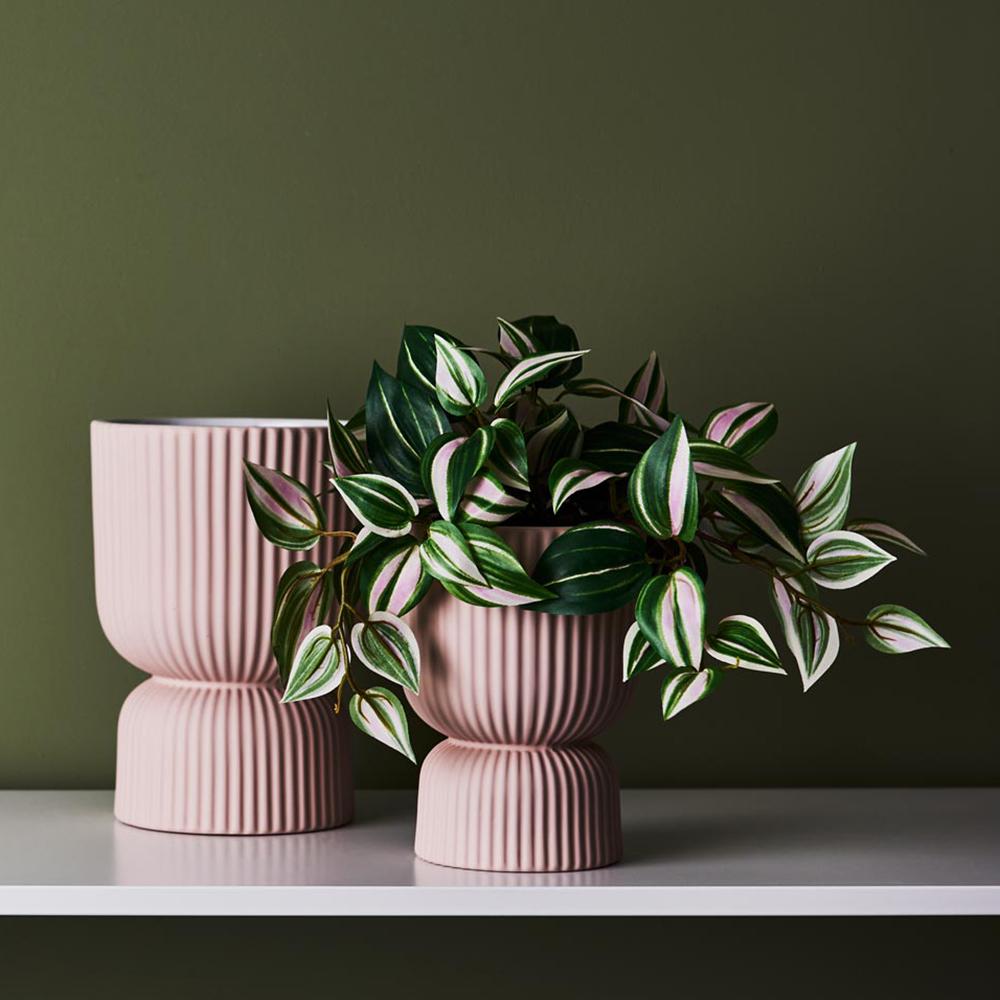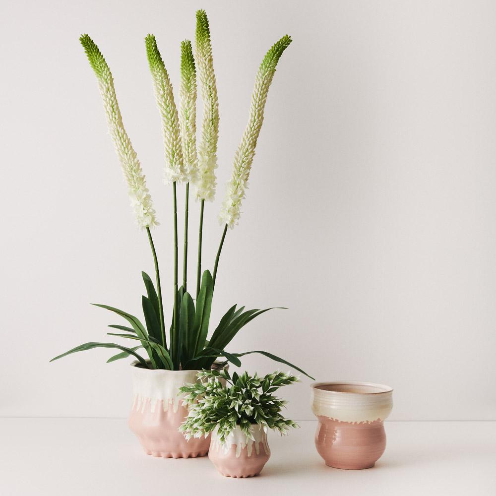 Our Palina Pot in Light Pink has a satin matte coating with a soft velvet feel and a high gloss white glaze inside. It’s not only eye-catching on its own, but pairs perfectly with our extensive range of artificial plants and greenery to create vibrance in any home or office. This ceramic pot is handmade, due to the nature of handmade items there may be slight variations in the size, surface texture, glaze consistency, colour or tone of the pots. This pot is suitable for indoor use and does not have a drainage hole.