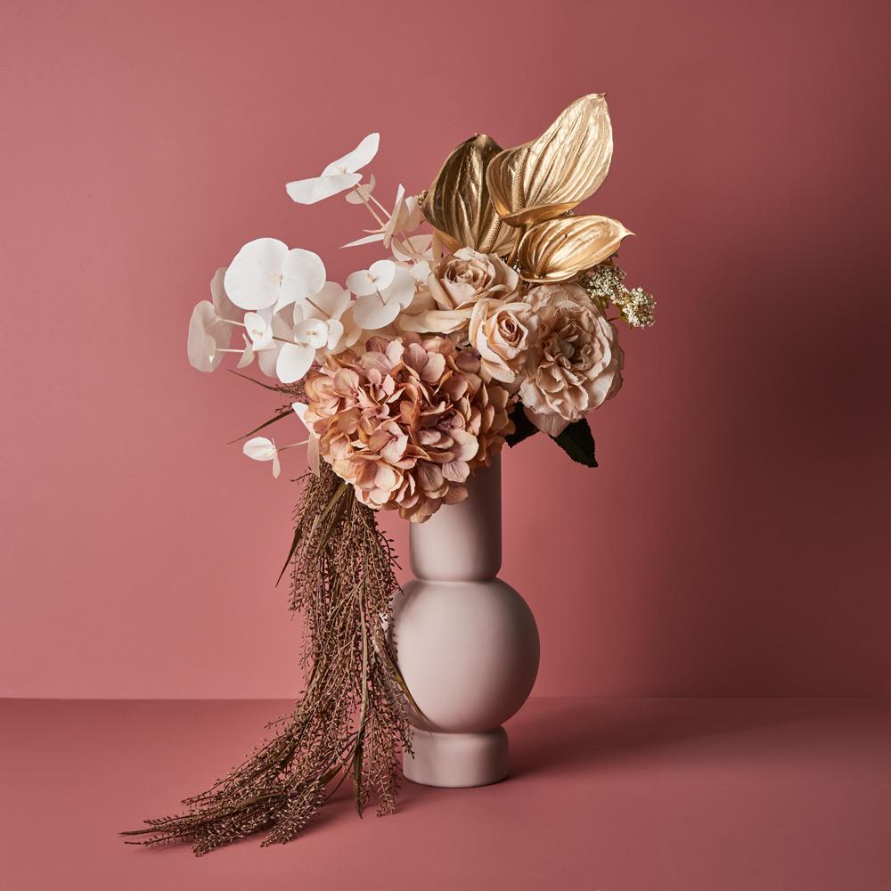 Our ceramic vase Isobel featuring a light pink satin matte coating with a soft velvet feel is the perfect vessel to style your artificial stems in any space. Select from our extensive range of artificial stems to compliment. This ceramic vase is handmade, due to the nature of handmade items there may be slight variations in the size, surface texture, coating consistency, colour or tone of the vase.