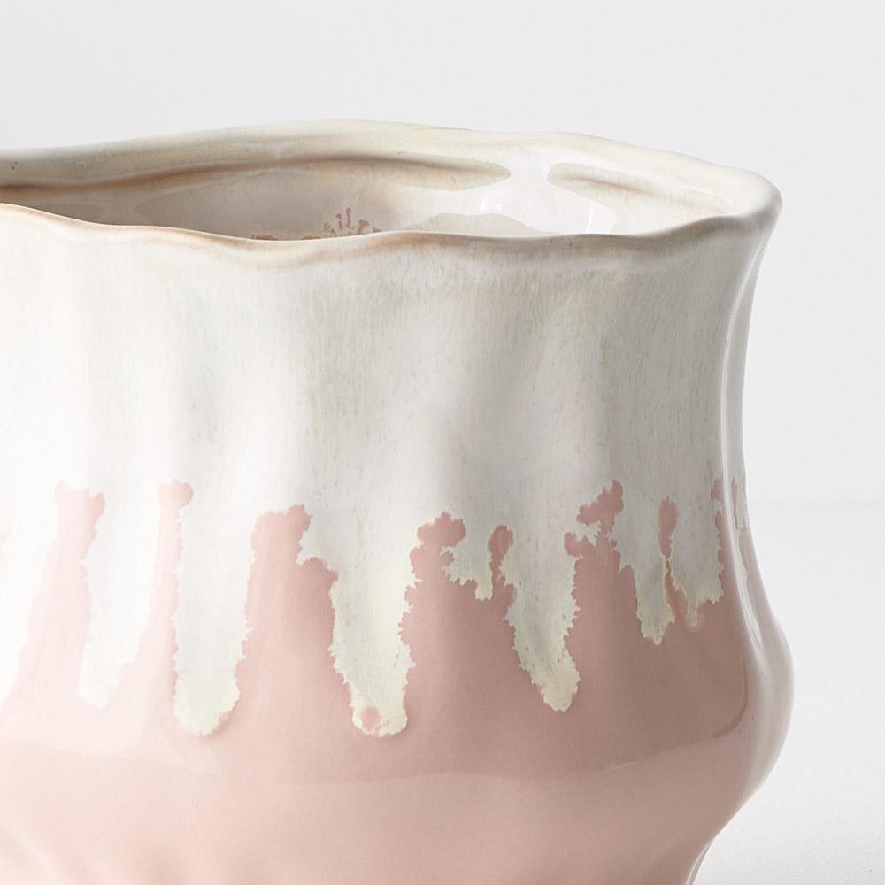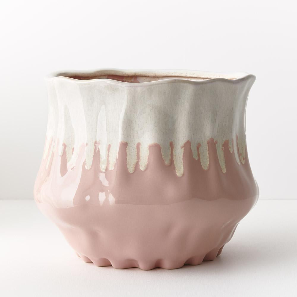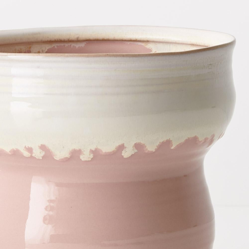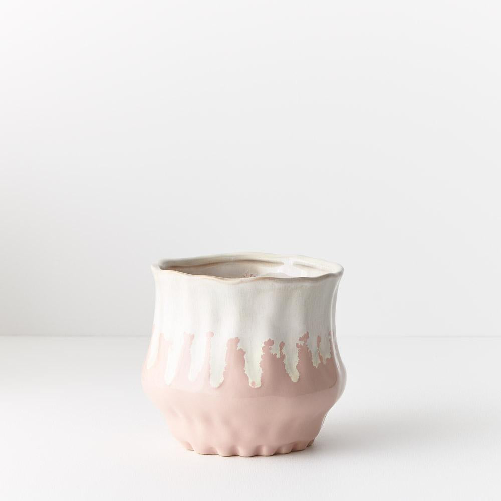 The Jesse Pot exhibits a charming blend of white and pink hues seamlessly merging into a delightful, glazed finish. Ideal for small plants and arrangements, its unique design adds a touch of elegance to any space, making it a perfect choice for both botanical displays and decorative accents.