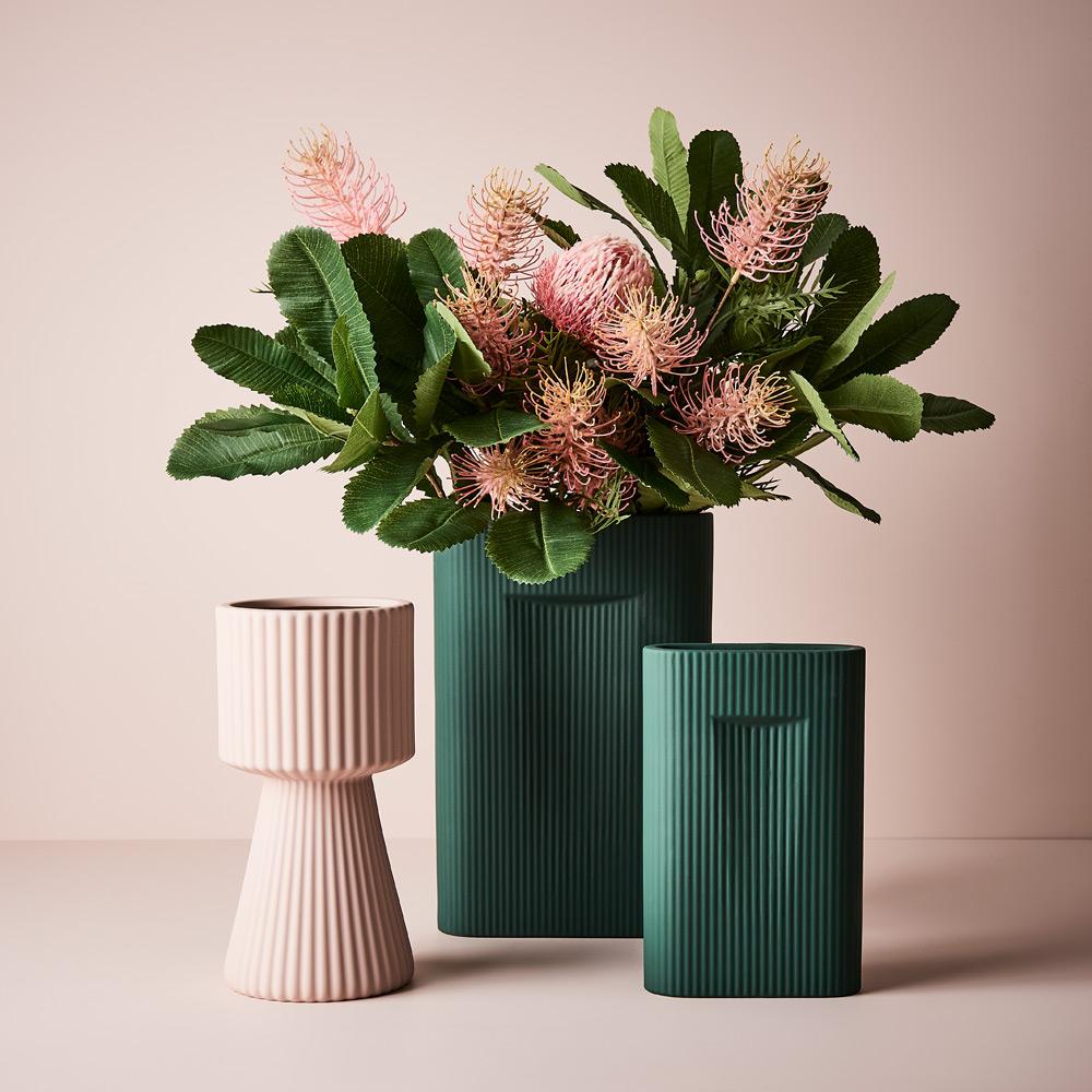 Our ceramic vase degana featuring a light pink satin matte coating with a soft velvet feel is the perfect vessel to style your artificial stems in any space. Select from our extensive range of artificial stems to compliment. This ceramic vase is handmade, due to the nature of handmade items there may be slight variations in the size, surface texture, coating consistency, colour or tone of the vase.