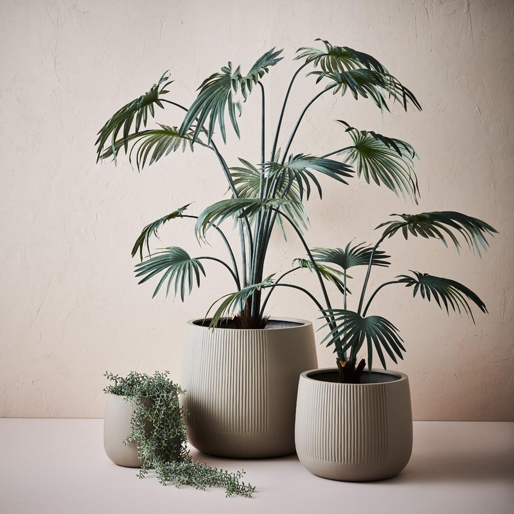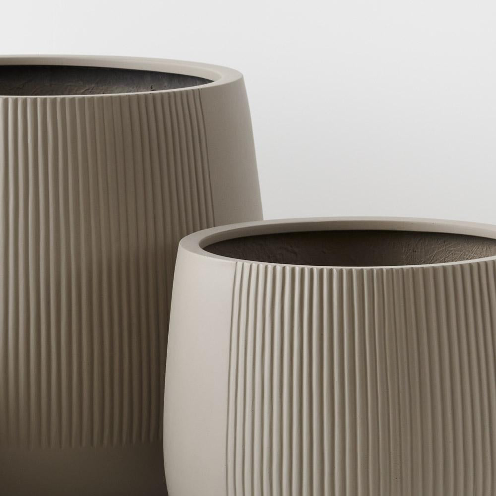 Dune Pedro pots come in a set of three. They feature a linear pattern on a section of the exterior. Their egg-shaped design harmonises indoor and outdoor spaces, offering versatility and style for nurturing plants in any environment.