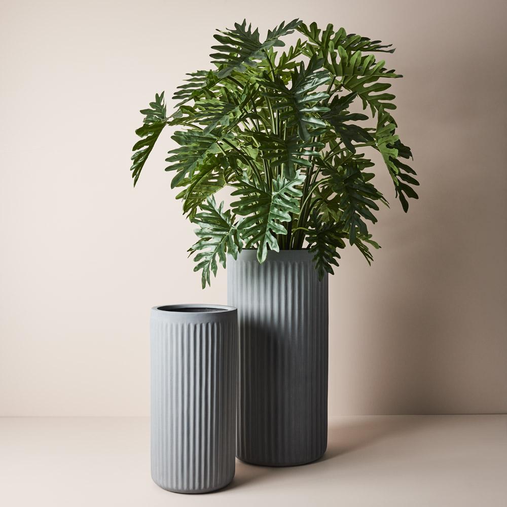 Our pot pleat cylinder tall (set of 2) in grey are the perfect modern vessel to style your plants in any space. These pots are handmade from polystone, due to the nature of handmade items there may be slight variations in the size, surface texture or colour. Suitable for indoor or outdoor use they all come with a drainage hole.
