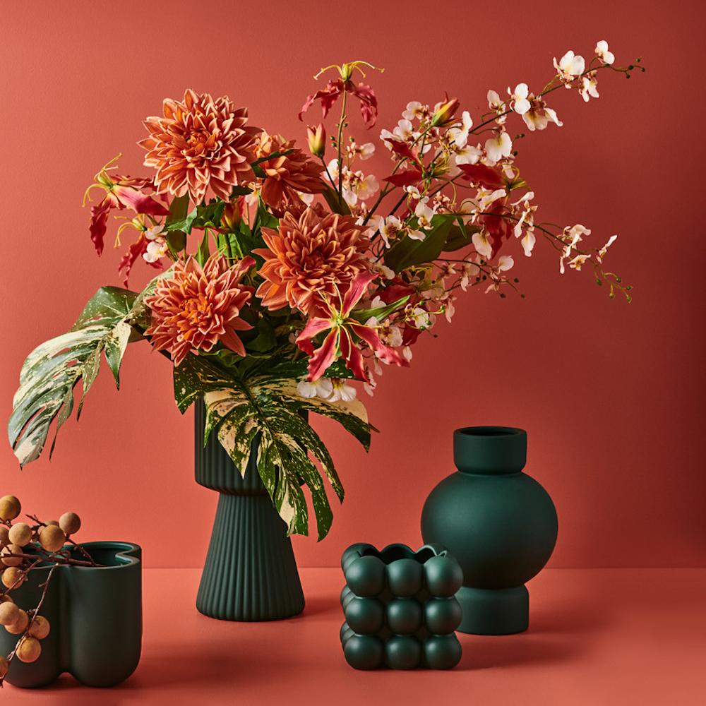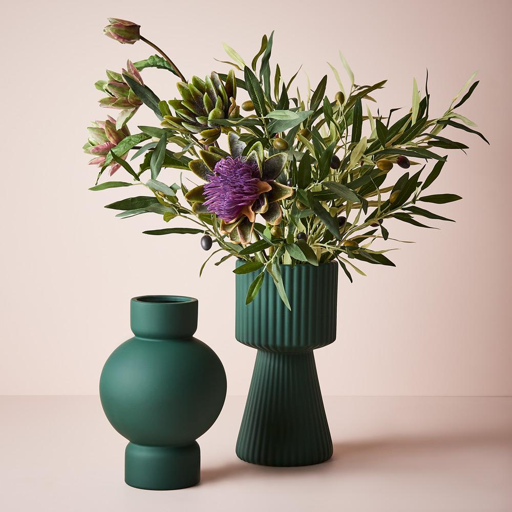 Our ceramic vase degana featuring an emerald satin matte coating with a soft velvet feel is the perfect vessel to style your artificial stems in any space. Select from our extensive range of artificial stems to compliment. This ceramic vase is handmade, due to the nature of handmade items there may be slight variations in the size, surface texture, coating consistency, colour or tone of the vase.