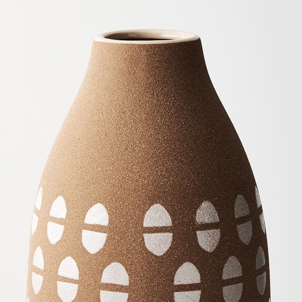 This ceramic Vase Nomad in Terracotta is handmade featuring hand painted patterns in earthy tones, due to the nature of handmade items there may be slight variations in the size, surface texture, glaze consistency, colour or tone of the vase.