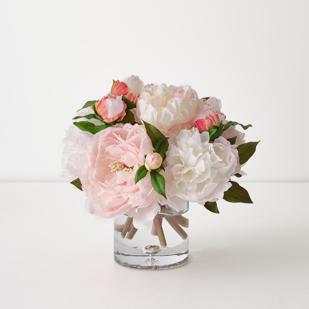 A vibrant mix of peony blooms beautifully arranged in a stylish vase. Fully finished and ready to display, it requires no maintenance.